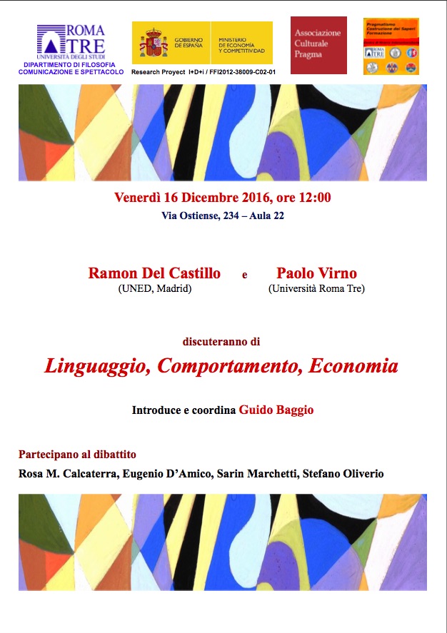 Il 16 dicembre 2016, presso il dipartimento di Filosofia, Comunicazione e Spettacolo dell’Università Roma Tre, Ramon Del Castillo e Paolo Virno discuteranno di “Linguaggio, comportamento, economia”, insieme a Rosa M. Calcaterra, Eugenio D’Amico, Sarin Marchetti, Stefano Oliverio e Matteo Santarelli.